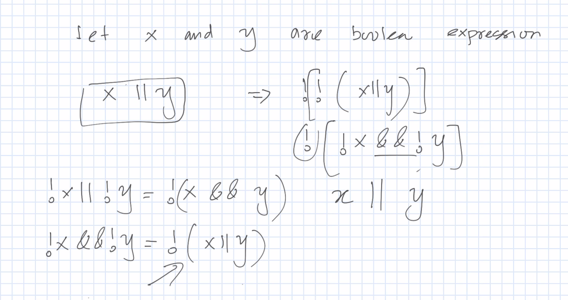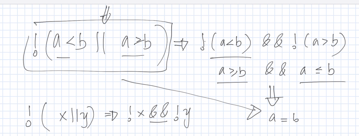 For any comparison between two booleans, you can either pull out !‘s from both, or distribute !‘s from an outside bracket. When distributing/pulling out !‘s, you switch the boolean operation from || to && and vice versa.