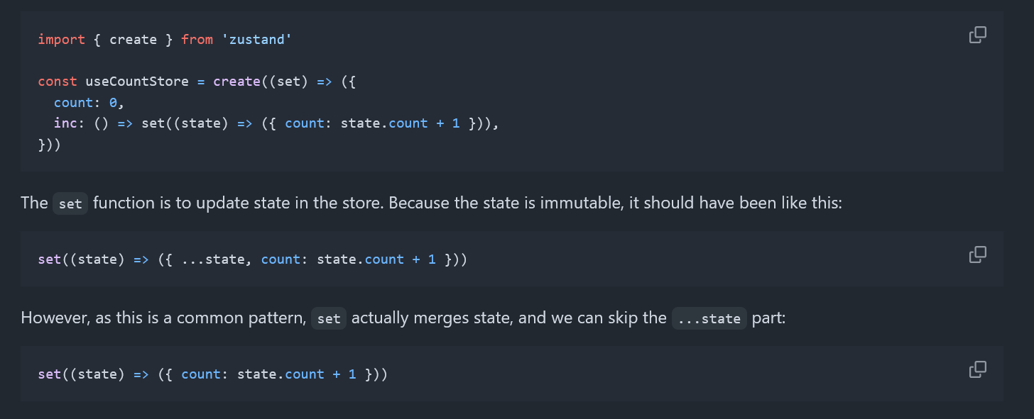console.log(thing.points); // This will now be 0; the functions do NOT changeThe above demonstrates “object spread syntax” in JS. What set does in Zustand is obfuscate all that boilerplate for you