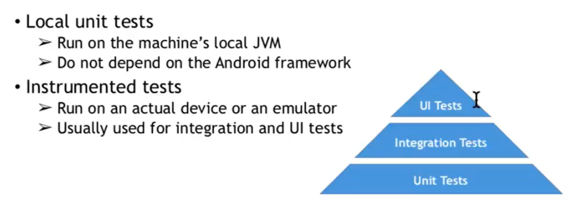 - Unit tests are easy to make. Doesn’t need emulator to make sense (i.e. calculating square root doesn’t need android to run)