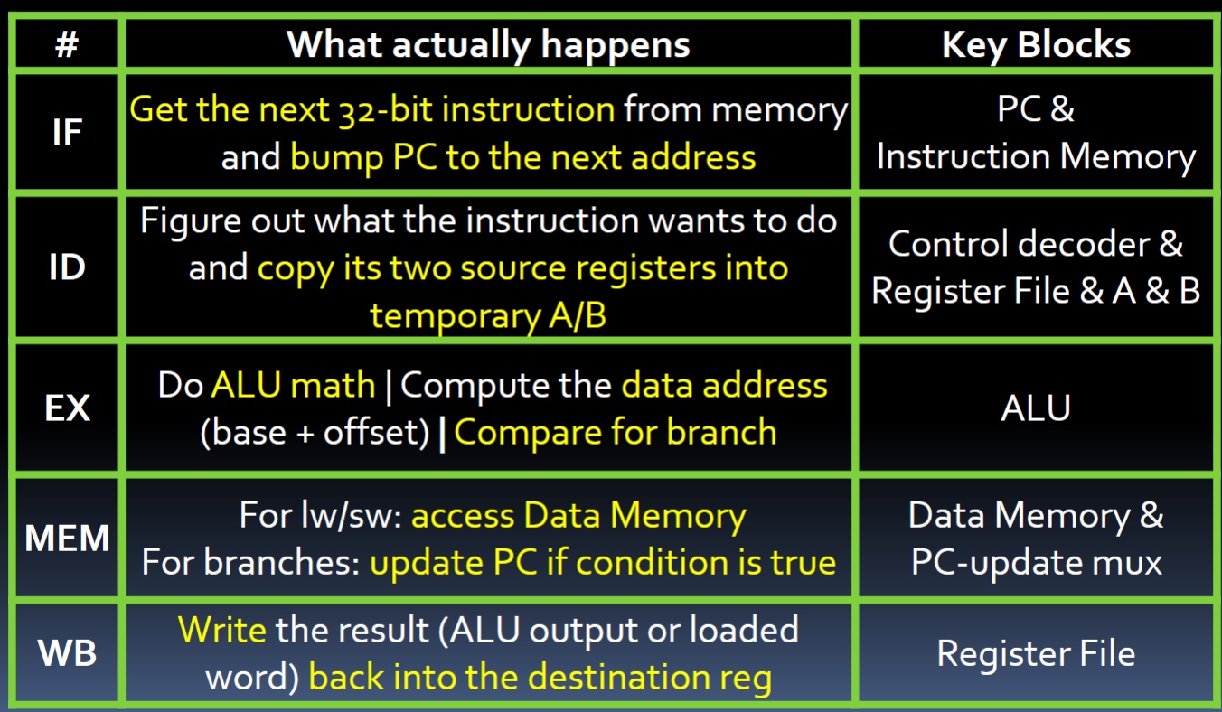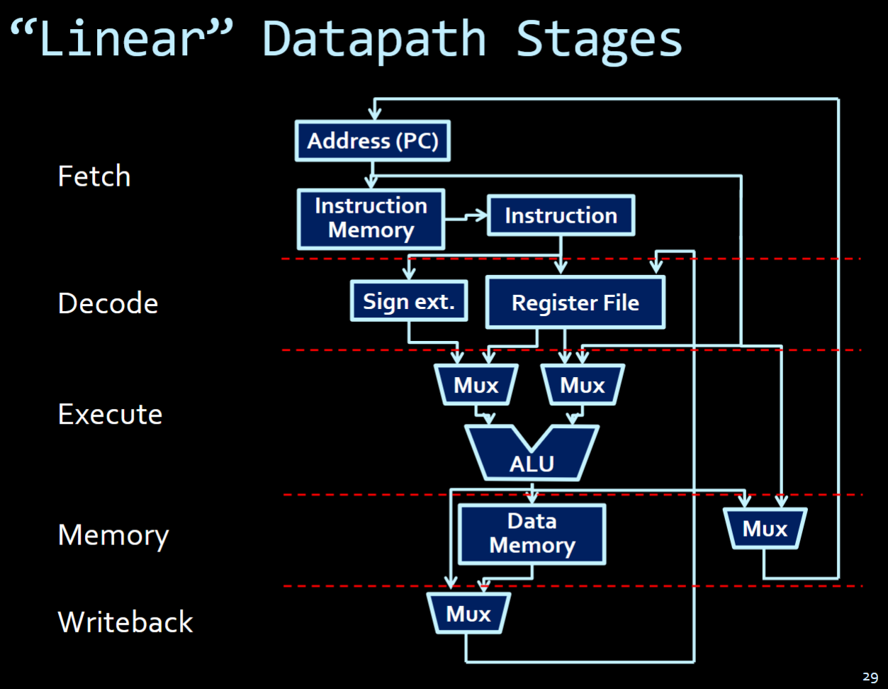 - A “pipeline” would split the datapath into stages separated by registers. So stage 1 finishes, then stage 2 can work on previous instruction while stage 1 fetches… and the slides DIE lol