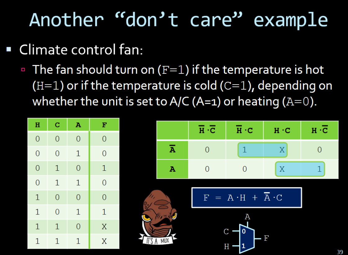 At the points where the temperature is both hot and cold, it makes no sense for there to be a result for the fan. Therefore we mark the output as “dont care” That also lets us turn the k-map into one identical to a mux