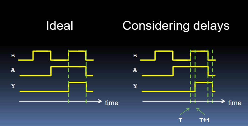 The ideal wave diagram will have “0” delay (so the changes go up/down instantly) right when the inputs also change (Time T). However when considering delays, the actual output is realized at a delay (Time T + 1)