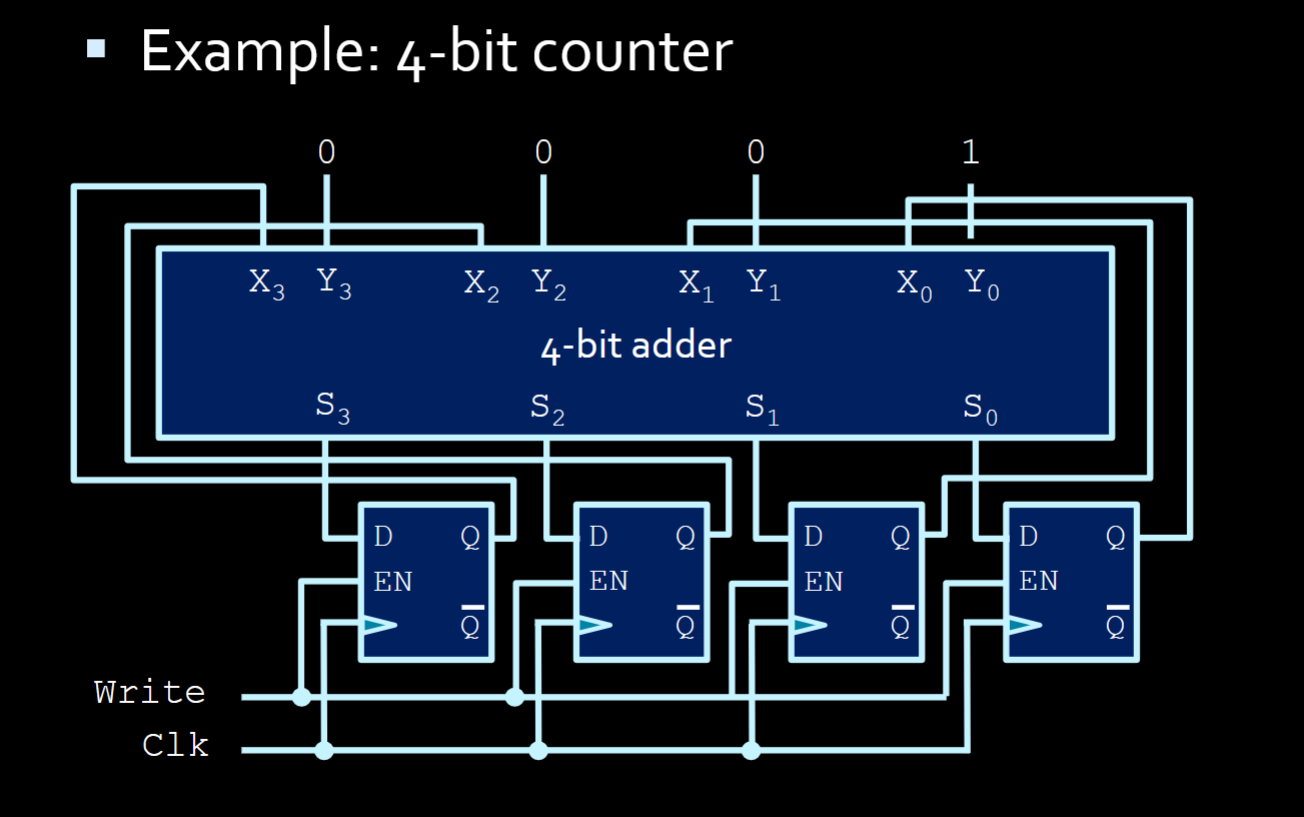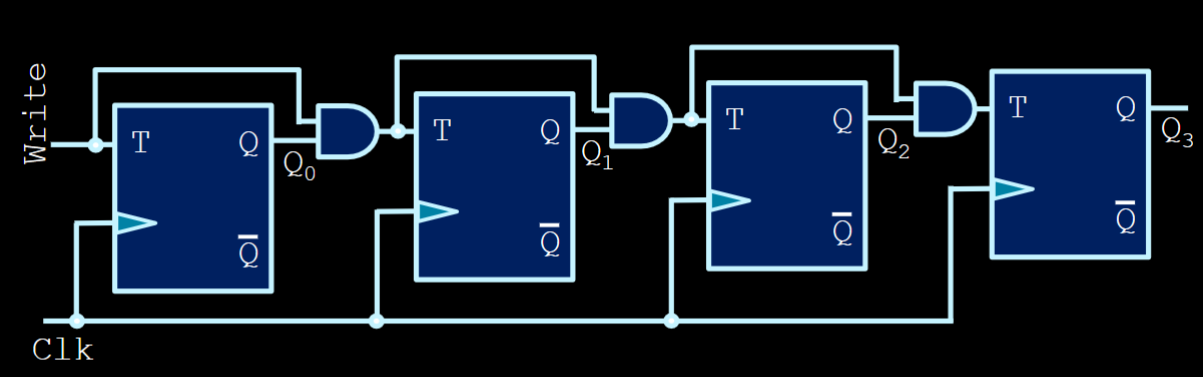 - Why? Well if Q is 1, write = 1, then T will flip from 1 to 0, and the AND gate will be satisfied, so the second bit will flip from 0 to 1. Wow.