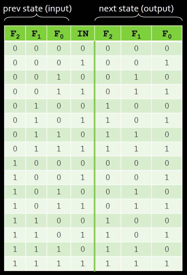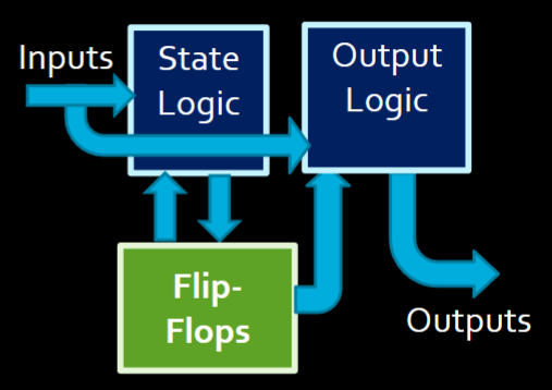 - The state logic takes the old state + new inputs and updates the state in the flip flops
