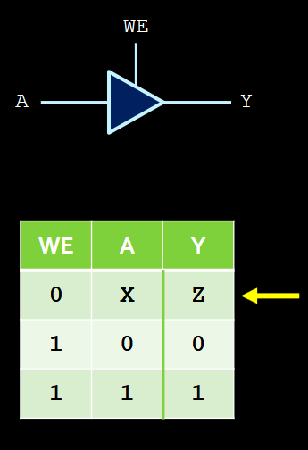 How do they work? Tri-state buffers! It’s literally just a switch. Input goes in and out, but WE determines if there’s a physical bridge or not between A and Y