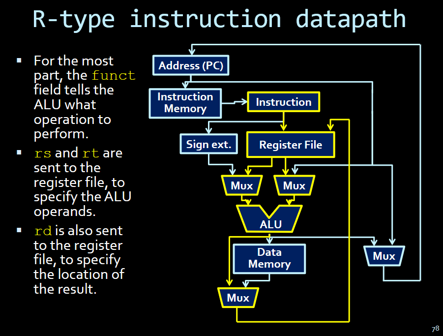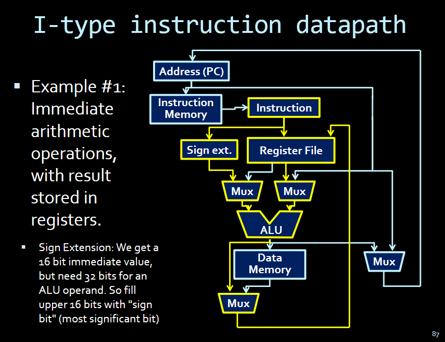 - Instruction, sign extension (for the immediate) register file, muxes, alu, mux to store result.