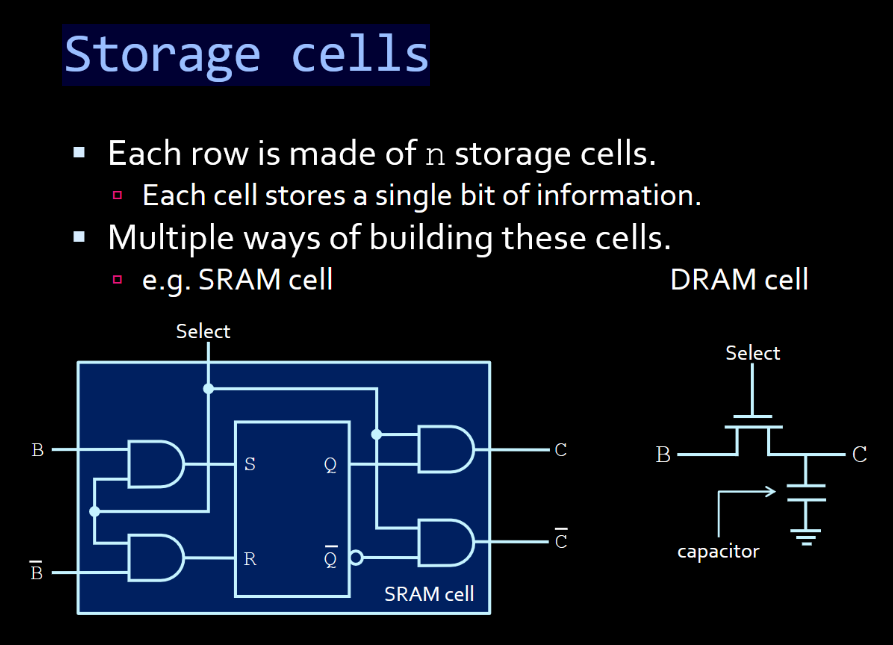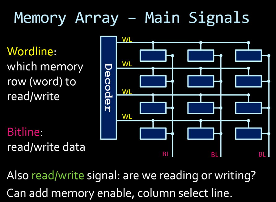 - Different from a register file cuz instead of an array of registers, we have rows of memory units / storage cells