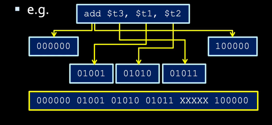 add $t3, $t1 $t2Then that’s translated to machine code:000000 01001 01010 01011 00000 1000001:1 mapping!