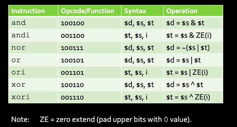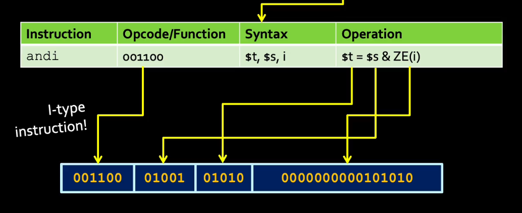 ZE(i)is zero extension (instead of sign extension) (padding upper bits with0values)t2 = t1 & 42is equivalent toandi $t2, $t1, 42iis42(constant! immediate!)