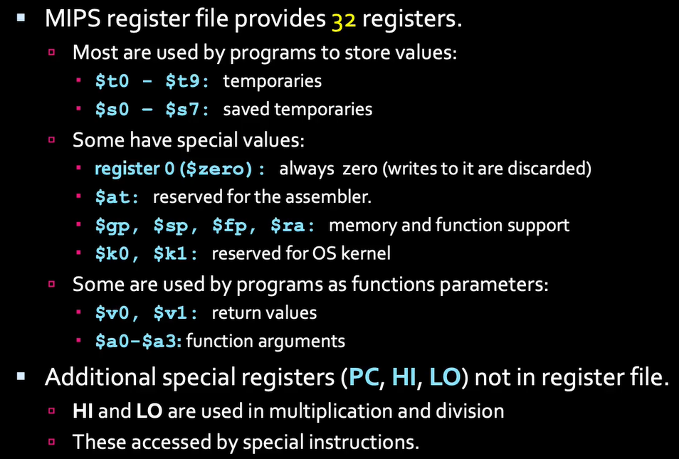 - MIPS register files have 32 registers. Numbers are kinda wack so we use short names like v1. There is also 0, $1, etc. if you wanna