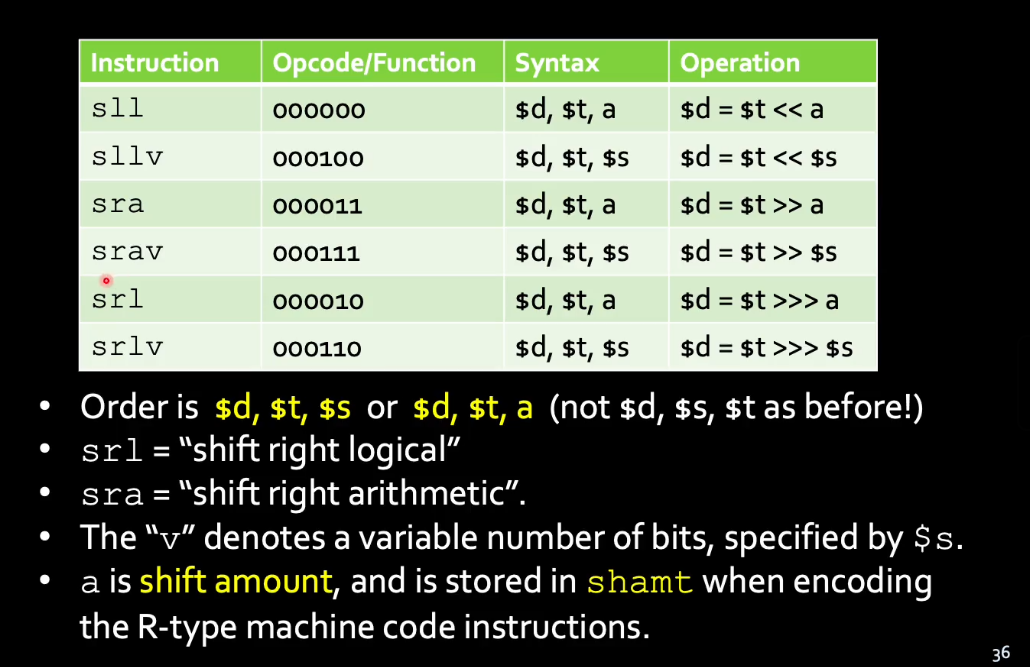 vdenotes a variable number of bits specified by$sais the shift amount- The v instructions instead of taking the # of bits to shift from a consatnd, it takes it from a register.