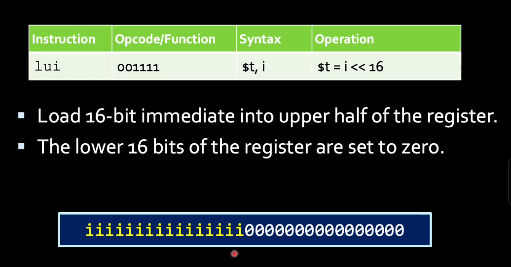 16bits. Registers have32. - lui loads the 16 bits into the upper half of the 32 bits. it shifts the immediate 16 bits. the lower 16 bits are set to 0.