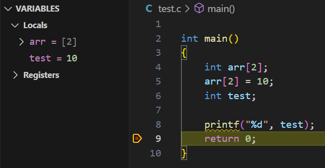 The above example is really good at demonstrating junk values. test was never set, however the third index of arrwas set (by accident; it’s outside of the array’s size!), and it spilled over into the container of memory that test has now been allocated too! The old data doesn’t get reset!!!
